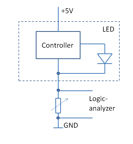 circuitI used this to extract the “control signal” to the LED and capture it with a logic analyzer, as shown in the circuit diagram. The variable resistor has to be adjusted so that it is large enough for the logical analyzer to see a current increase as ‘one’, but still allow the LED to function properly.