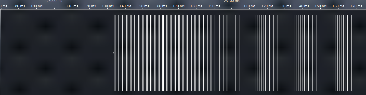 The diagram above shows about a minute of LED brightness variation sampled at 1MHz. It is obvious that there are periods where the LED is fully turned on and there are intervals when the LED is modulated in some way. It is never off for a longer period. The makes sense, because a real candle is at maximum brightness most of the time, interrupted by short periods of “flicker”.