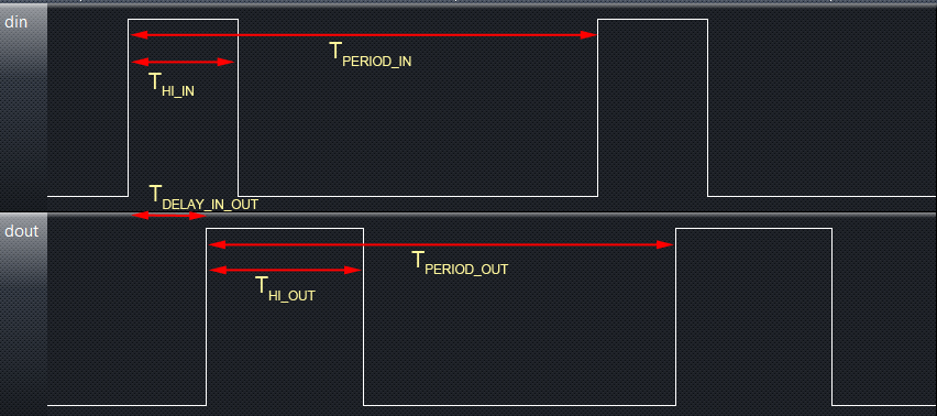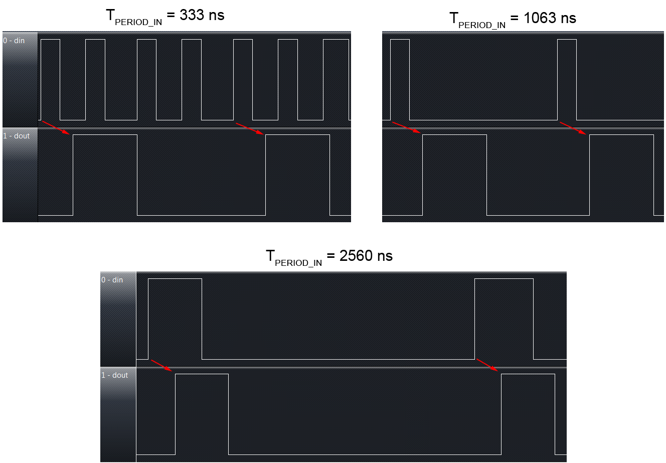 One of the first observations was that the delay between the leading edge of the input pulse and the leading edge of the output pulse, T_delay_in_out, was constant regardless of the timing of the input pulse.