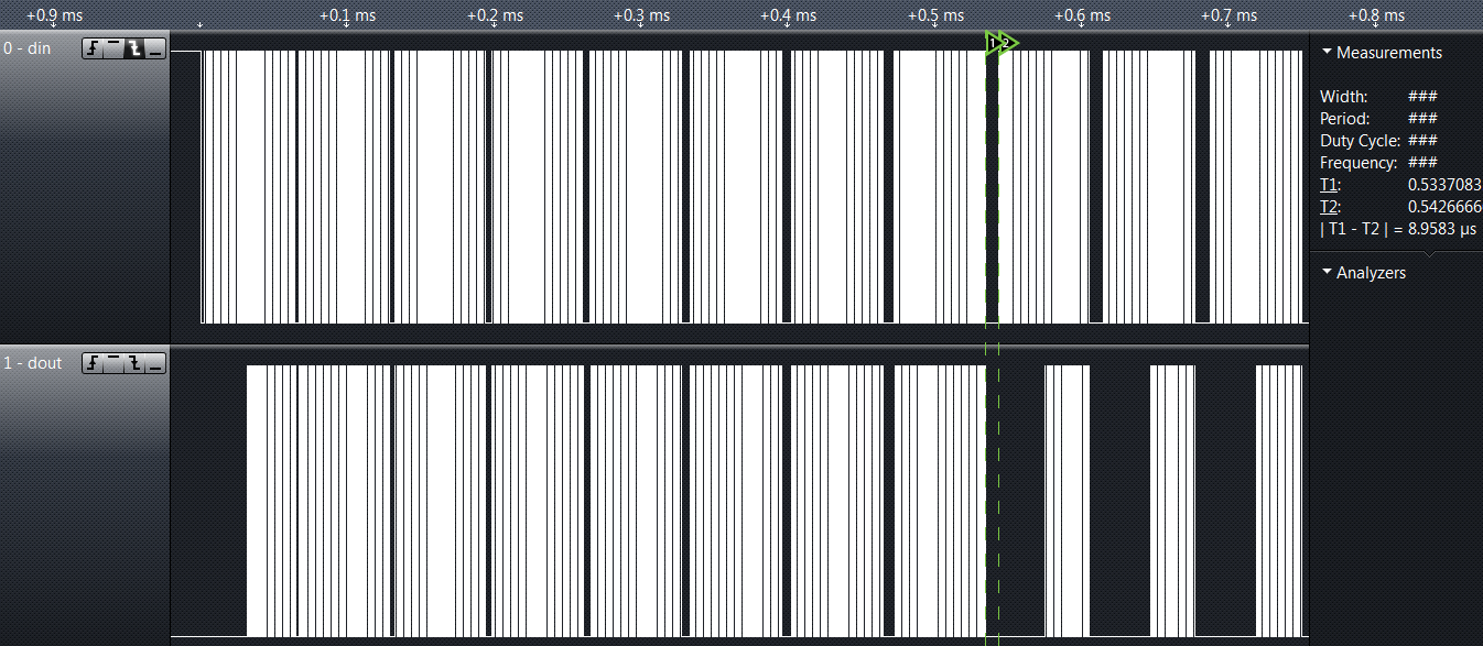 Luckily there is a relatively easy way to probe the inner workings of the device: When data is forwarded, it is passed through the internal reshaping mechanism. Therefore we can exercise Din and verify the correct interpretation of the input data by comparing it to Dout. To do this, I hooked a single WS2812 to a ATtiny 85 which took the role of a signal generator. I then monitored both Din and Dout with a Saleae logic analyzer. There are some issues with aliasing, since the maximum sampling speed is only 24 Mhz, but the data seemed still sufficient to understand the WS2812.