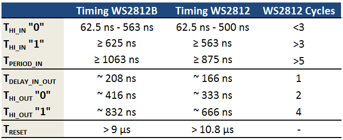 • A “1” can be encoded with pulses almost as long as the total cycle time, but it should not be shorter than ~625 ns (minimum on WS2812B).