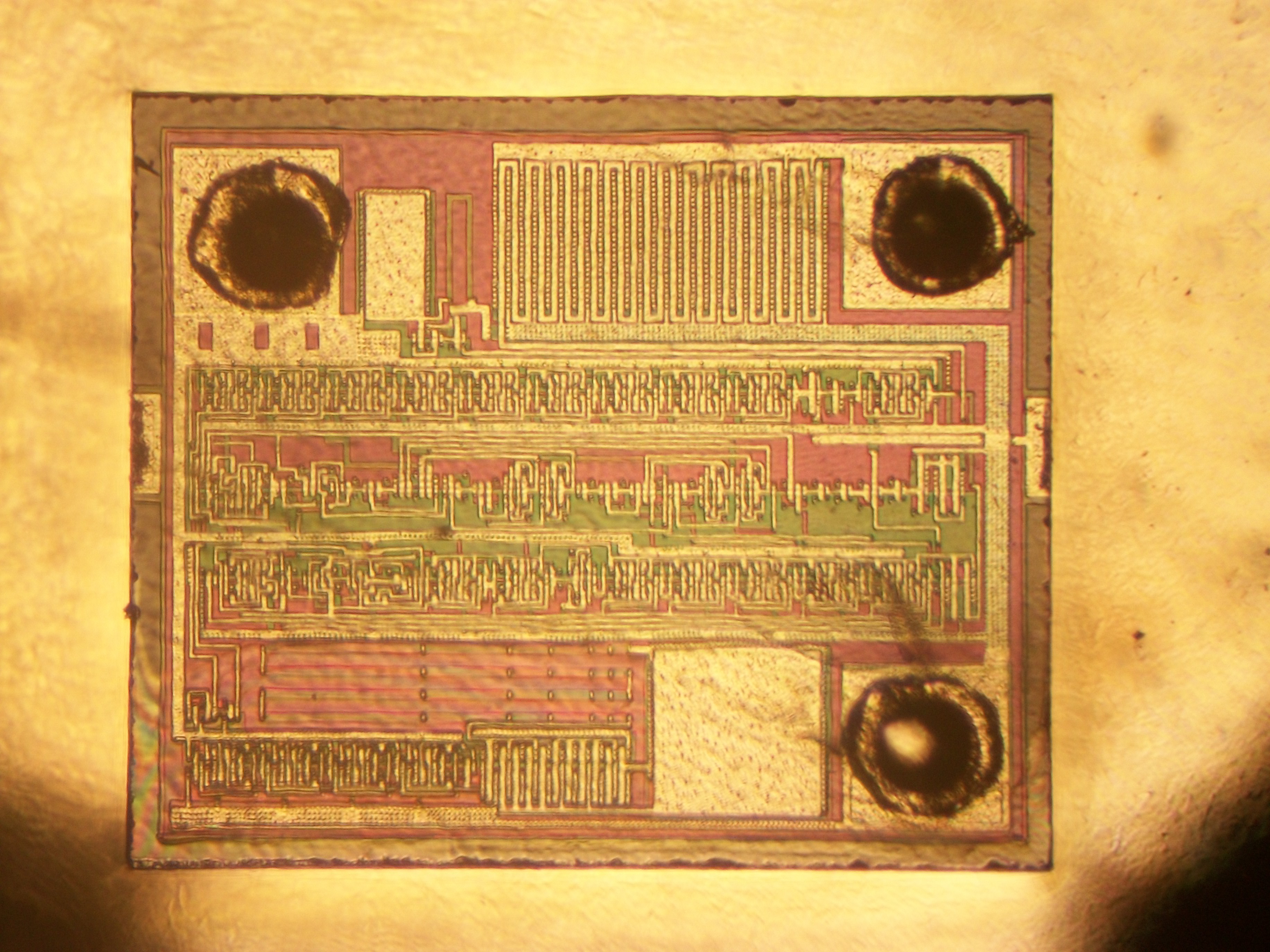 He managed to obtain very high-resolution optical microscopy images of the top-level metal. It turns out that the controller chip is manufactured in a relatively coarse CMOS process with one metal layer and 1-2 µm resolution. This is 1980ies technology. But of course, that is all that is needed for a circuit as simple as a flicker-LED.