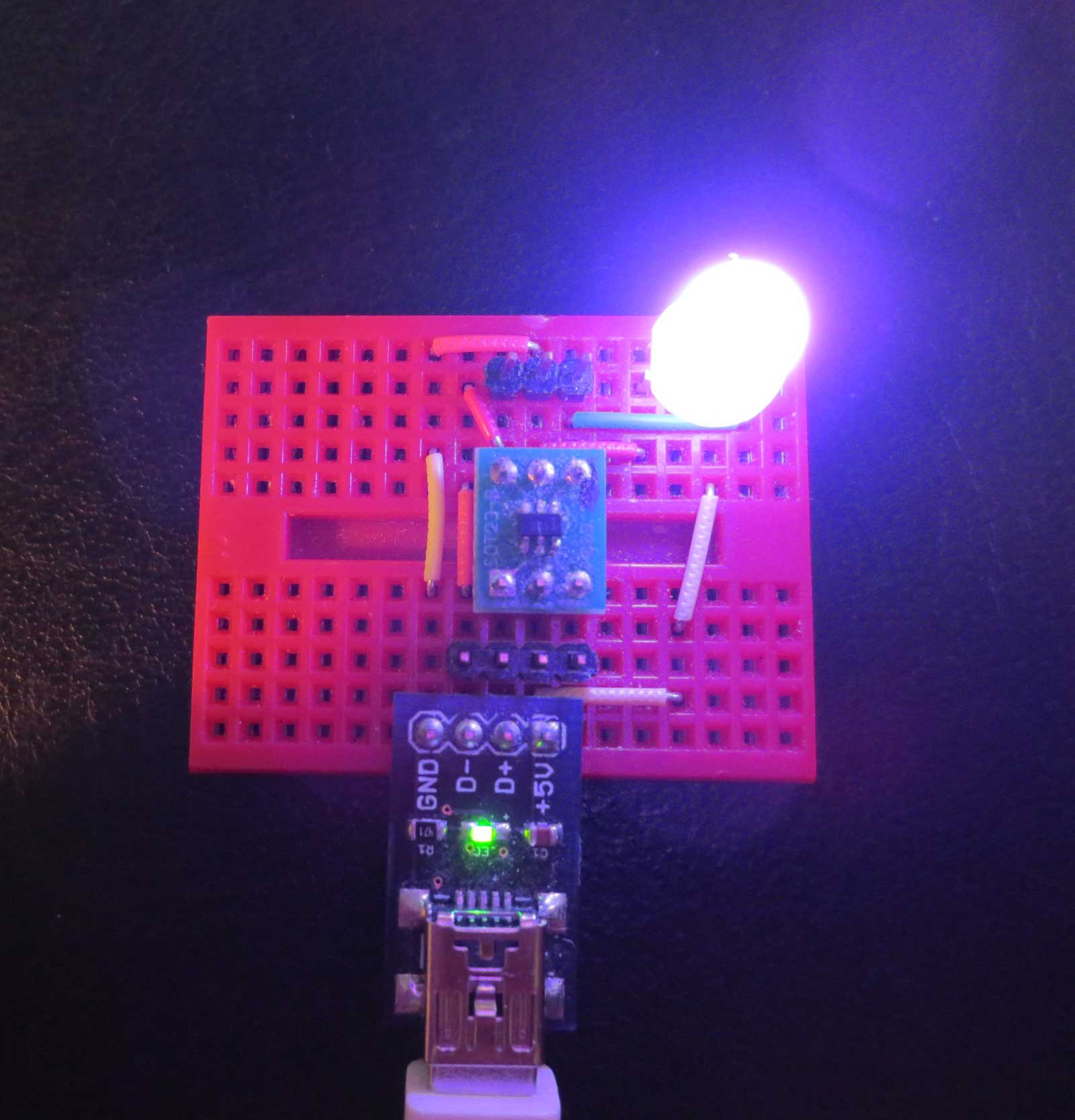 Littlewire supports several functions to control WS2812 LEDs on arbitrary I/O ports. I simplified this to only supporting a single LED on a specific pin, however still retained protocol compatibility. This means that all the little-wire host-programs still work. The finished device can, for example, be used as an RGB indicator LED similar to the Blink(1).
