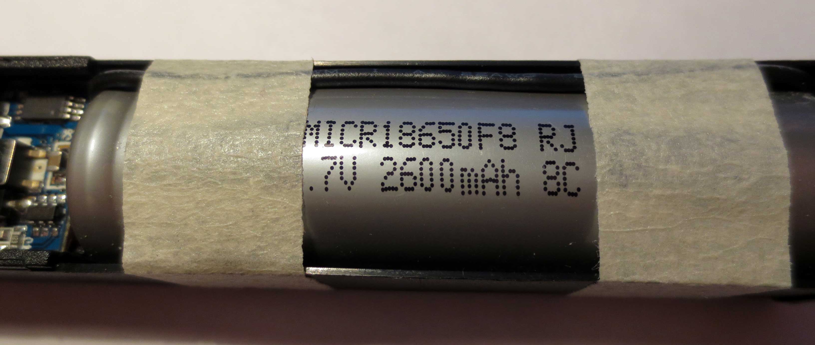 The pictures above show the innards of the device. Most space is taken up by an ICR18650 LiIon battery, which are relatively common devices with 2600mAH. In addition, there is a tiny tiny PCB.
