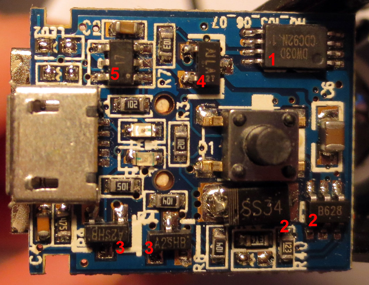 1. [5] is likely to be the USB linear charge regulator, used to manage the constant current and constant voltage stages of charging. It will also drive the indicator LEDs to show ‘charging’ or ‘charged’ status.