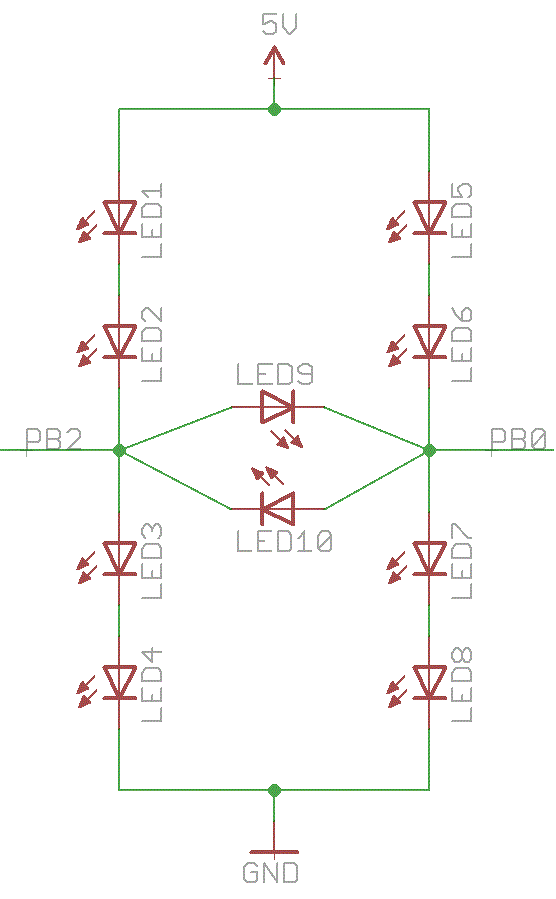 A quick test (LEDs not arranged in dice pattern) showed that the new multiplexing scheme works nicely. Note that the circuit relies on current limiting by the internal resistance of the AVR I/O ports. This does work, but is something that should be avoided in “real” designs…