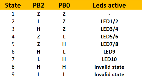 When one PB0 or PB2 is H or L and the other pin is Z, sufficient voltage is present for a pair of LEDs to light up. However, when PB0 is H and PB2 is L, or vice versa, LED9 or LED10 are connected in parallel to a pair of LEDs. This will cause the majority of the current to flow through the single LED so that only LED9 or LED10 light up.