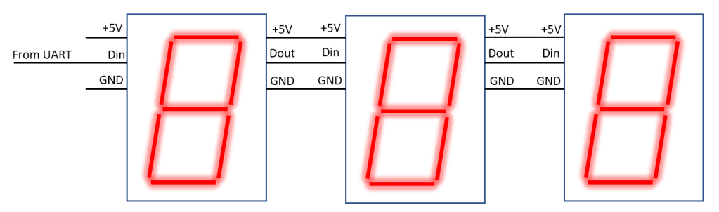The figure above shows the general concept: Each segement has a serial data input and a serial data output which allows controlling the content of the display. The data from the input of each segment is forwarded to the next, so that it is possible to connect the next digit directly to the output of the previous. Power supply will be routed through all devices.