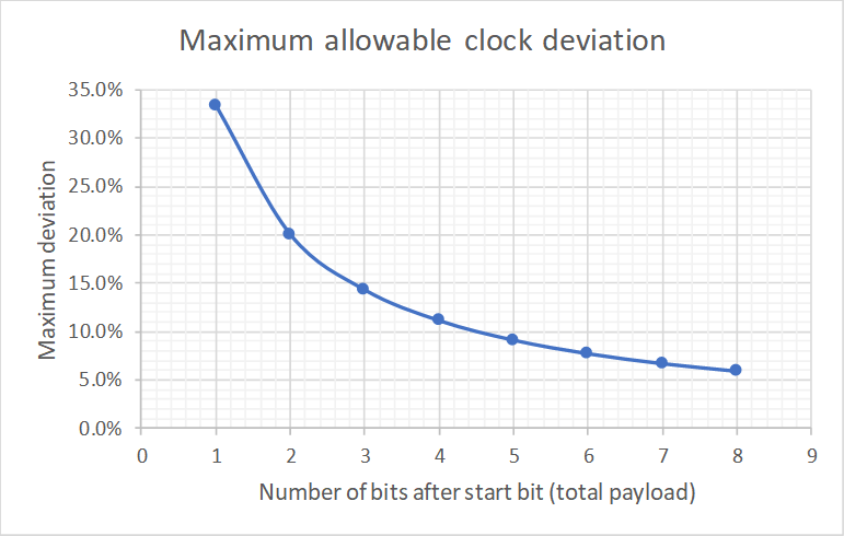 The relationship between number of bits per frame and maximum allowable clock deviation is shown above. One has to consider that the tolerance is shared between transmitter and receiver. For example, for the 1N1 protocol, the transmitter may skew by -17% and the receiver by +17%.