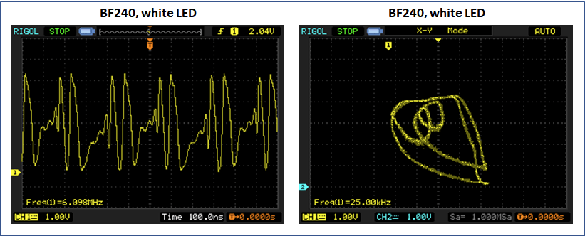Btw – the oscillation is actually not random. It’s not a random oscillator, but a chaotic oscillator. It oscillator exhibits nonlinearities that leads to complex but repeating oscillating patterns depending on applied voltage. This is why the X-Y plots follow stable trajectories. However, depending on voltage, also randomly looking oscillations can be observed.